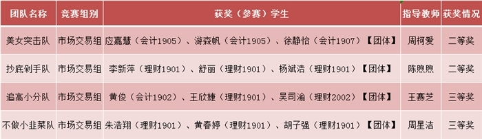 高职策略赛项包括撰写投资策略报告、策略实盘交易、撰写实操报告和在线答辩四个环节。经过各环节的层层比拼,我校从参赛的高职134支队伍中脱颖而出,由周柯爱老师指导的“太极两仪”团队、“罗旋三部曲”团队,由周星洁老师指导的“股市不锈钢”团队获一等奖,另外六支团队分获二等奖两项、三等奖四项。在市场交易赛项中,我校共6支团队分获二等奖二项、三等奖二项。