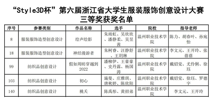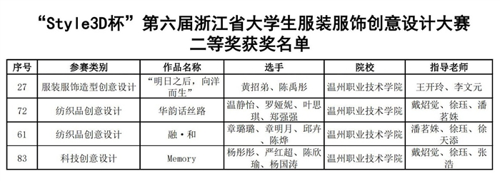 本网讯(设计学院通讯员 叶晓露 陈力 徐珏)11月7日,“Style3D杯”浙江省第六届大学生服装服饰创意设计大赛决赛落下帷幕,我校副校长王志梅出席闭幕式。由我校设计学院选送的参赛作品斩获一等奖4项、二等奖4项、三等奖5项,陈力等8位老师获优秀指导教师奖,学校获优秀组织奖。获奖数量和质量均实现历史性突破,其中,一等奖获奖数位列全省高职院校第一、在温高校第一。