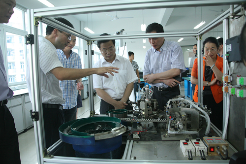 陈一新书记一行在我院党政领导班子的陪同下,首先视察了校内实训基地及科技研发大楼。视察中,我院领导向陈一新书记汇报了我院校园形态、基地建设等方面的情况。陈书记对我院的基地建设模式表示充分肯定,并对我院多年来为实行校企合作、服务地方经济社会发展所作出的努力进行了肯定。
