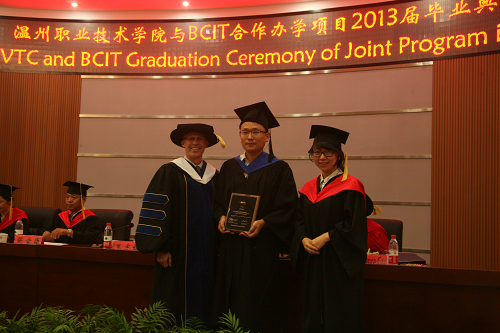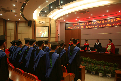 7月1日上午,庄严肃穆的《义勇军进行曲》和《 O Canada 》回响在温职院的校园,学院迎来了2013届中加合作班毕业典礼。上午11点整毕业典礼在正德楼罗山厅正式拉开帷幕。加拿大不列颠哥伦比亚理工学院(BCIT)副校长Dangerfield先生、国际学院院长谷丰博士,我院副院长王志梅、机械系主任南秀蓉、教务处处长张宝臣出席典礼仪式。仪式由南秀蓉主任主持。