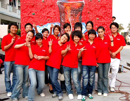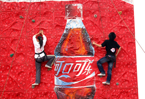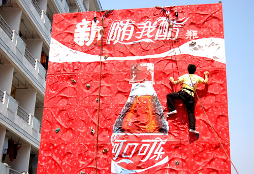 攀岩比赛在大家翘首仰望红色“室外岩壁”的神情中拉开序幕。10多名人高马大的大学生绑好特殊的绳索,在大家的欢呼声中登场了。许多喜欢看体育节目的大学生都曾在电视中看过“攀岩”运动,但报名参加此次比赛的选手大多是第一次亲密接触这项运动。据现场工作人员介绍,日前可口可乐公司在全省各高校设立赛点举办“迎奥运、随我酷”攀岩大赛,最终将选拔出色的选手进入5月份举行的总决赛,以此来迎接2008奥运会的到来。赞助商选择高校学生作为参赛对象的出发点,在于校园攀岩大赛这种形式新颖的比赛,与大学生富有激情的特点十分吻合,奥运精神也在比赛过程中得到了深入广泛的宣传。攀岩运动能锻炼大学生们的‘永攀高峰、挑战自我、奋发向上’的意志品质,学校也希望把这项带有青春激情的运动引入到学校中来,让更多的年轻人能爱好运动,接触新鲜的运动项目。