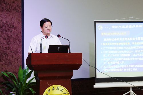 在论及如何“文化育人,质量立校”时,陈光天书记代表学院做了题为《加强文化建设,共创和谐校园》的精彩报告。陈书记围绕“问题的提出:文化建设的必要性”、“工作的探索:文化建设的实践回顾”和“未来的思考:文化建设的路径选择”谈了自己对高职校园文化建设的思考,并对我院校园文化建设工作做了总结回顾和展望。他先是从国家民族的宏观,从学校校园的中观和从教师个人的微观三个层次,在理论层面论述了高职院校开展校园文化建设的必要性。随后,他以“有的放矢,简明设计工作路径”为题,从教师、学生、环境三方面,对我院近年来文化育人工作的实践路径做了回顾,以“持之以恒,深入推进品牌创建”为题,对我院文化育人的工作成果做了总结概括。他提出,高职院校的校园文化应该具备高校特色、职教特征和区域特色等三大特点,即“具备大学精神,坚守大学使命”、“以能力为本位,突出职业特色”、“以培养符合区域经济发展需要的技术应用型人才为目的”。 针对如何加强高职院校校园文化建设这一命题,陈书记逐层深化,分别从物质文化、制度文化、精神文化、行为文化四个层面提出了校园文化建设的途径选择,并介绍了我院开展校园文化建设的具体路径和载体设计。