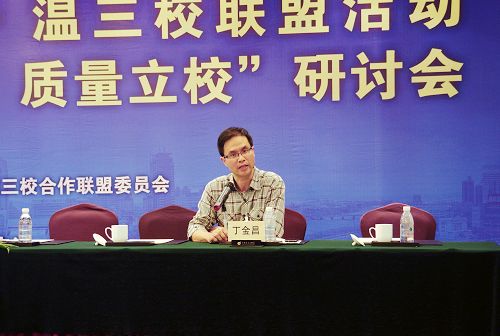温州职业技术学院院长丁金昌主持主题研讨的第一环节——共议高职前程。丁院长提到,经过五年发展,杭宁温三校联盟已经做到从封闭到开发,不做“富人俱乐部”,要与全国高职院校一起相互探讨,共同提高。针对如何办好高职教育,他认为,高职教育既要注重外围环境的优化,更要做到质量要提高,定位要提升,实现内涵的发展。就如何实现高职院校更好的前程,他提出了自己的三点建议。第一,要以需求为导向,实现开放发展,要对接区域产业、行业的需求办专业,以自身优势吸引政府、行业、企业来合作办学;第二,要以学生为本,特色发展,要从市场需求、学生要求和学校自身条件的结合点办学,以满足学生的就业,实现学生的全面、特色发展为最终目标;第三,要以产业转型升级为契机,创新发展,创新是大学的灵魂,而高职院校的创新在于校企合作,为新技术的应用、为新产品的开发,为企业的策划、成果的转换做力所能及的研究,这就是“立地式”的研发,也是高职院校赢得和政府、行业、企业的合作和认同的资本。他认为,只有通过这三方面的努力,高职教育的前程必然是光明的。
