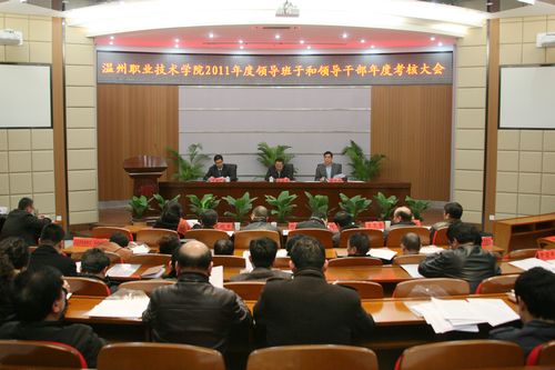 根据省委组织部、省教育工委、市委组织部的工作安排和要求,3月6日下午,我院于行政楼一楼多功能厅举行了学院领导班子和领导干部2011年度考核大会。温州市委组织部副部长杜建平,温州市委组织部干部三处副处长郑祥滩,温州市委组织部干部三处主任科员郑国胜等出席了会议并监督评议。学院领导班子成员,院在职副处及以上中层干部、院级及以上科研院所负责人、正高职称教职工,民主党派、无党派人士代表,院本届“两会”主席团成员,本届省市人大代表、政协委员参加了会议。会议由学院党委书记陈光天主持。