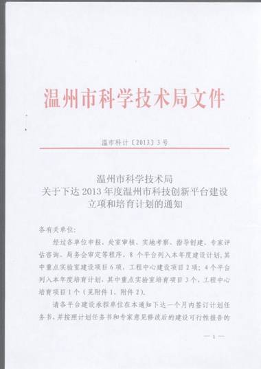 据温州市科学技术局“2013年度温州市科技创新平台建设立项和培育计划通知《温市科计【2013】3号》”,我院的“温州激光应用工程技术研究中心”经过科技局处室审核、实地考察、专家评估咨询后,被列入本年度温州市科技创新平台建设项目;另外我院的“温州市聚合物材料及机电产品表面改性技术研究重点实验室”和“温州市云计算应用工程技术研究中心”被列入本年度培育计划。