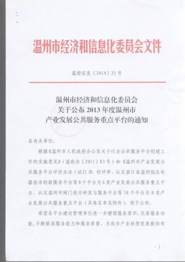 温州市经济和信息化委员会公布了“2013年度温州产业发展公共服务重点平台的通知《温经信发【2014】25号》”,我院的“温州市阀门技术研发与服务平台”经评审,被认定为2013年B类产业发展公共服务重点平台。
