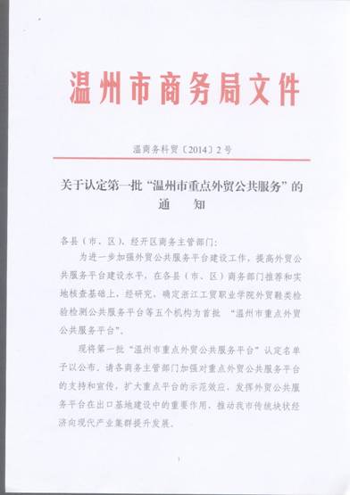 温州市商务局下达了“第一批温州市重点外贸公共服务平台的通知《温商务科贸【2014】2号》”,我院的“温州市制鞋行业公共技术研发平台”在各县(市、区)商务部门推荐和实地核查基础上,经过层层选拔,专家评议,被确定为温州市首批市级重点外贸公共服务平台。