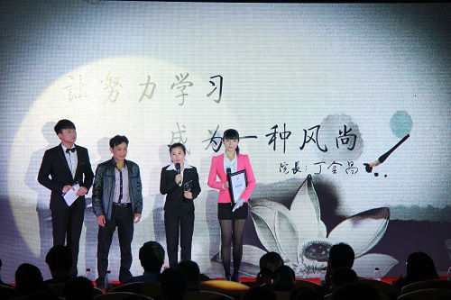 为了在广大同学中树立一批勤于学习、善于学习的先进学子,以实际行动“让努力学习成为一种风尚”。在昨天的颁奖典礼上,努力、学习、责任、坚强、大爱等等这些词汇,再次转化为行动,触动我们的心灵。本次颁奖典礼的各个环节独具匠心,别出心裁,院团委分别对获奖学生的任课教师、思政辅导员、同学等进行了采访并制作成视频,师长、同学等分别从不同的视角对获奖学生作了综合评价,同时也对他们提出了中肯的建议和希望,获奖学生身着礼服走过红地毯登上领奖台,院系党政领导为其颁发荣誉证书和奖杯,观众席上时不时传来阵阵掌声,现场互动热烈,观众在“黄蓉蓉震撼人心的学习力量”中再一次感受真诚的感动,将活动现场的气氛推向了高潮。