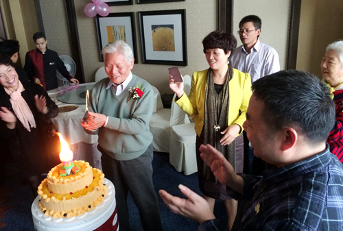 90岁的离休老校长孙大征老师代表寿星们在集体祝寿仪式上点蜡烛、切蛋糕,衷心感谢学院长期以来对老同志无微不至的关怀,并表达了自己对如今美好生活与学院发展的由衷高兴!参加活动的老师为寿星们集体唱响了生日快乐歌!