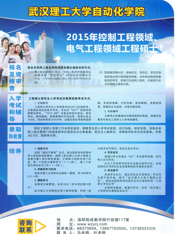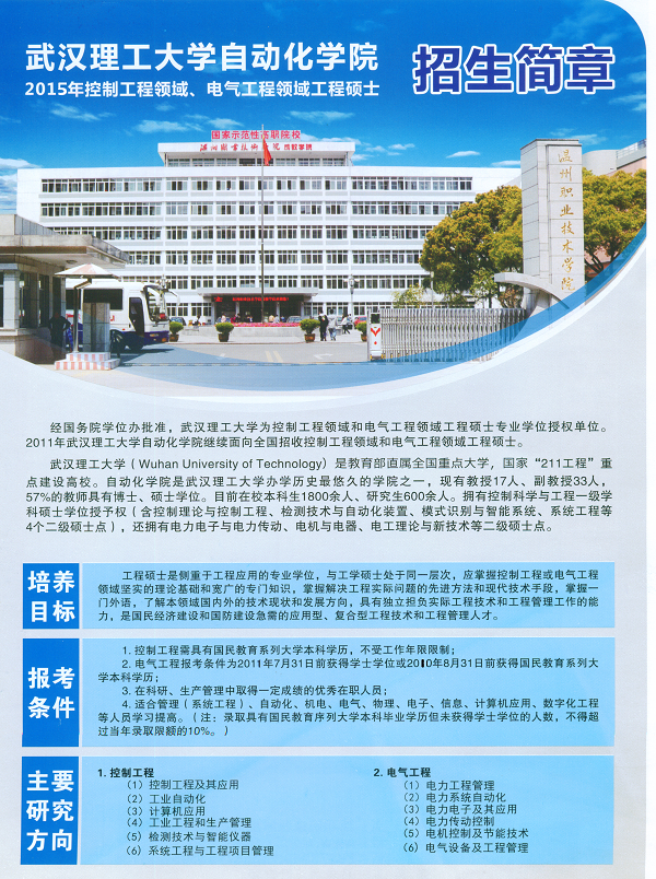 武汉理工大学自动化学院2015年 控制工程领域、电气工程领域工程硕士招生简章